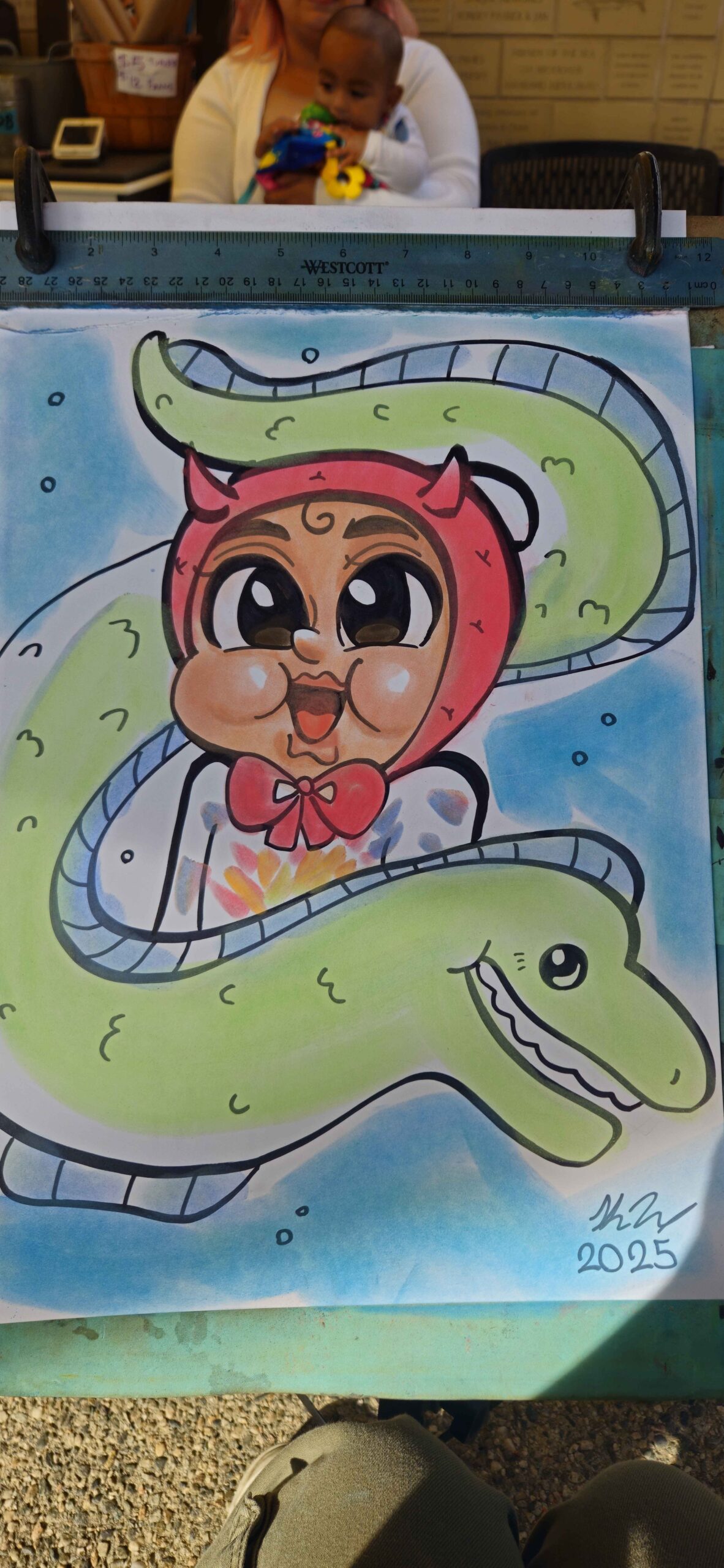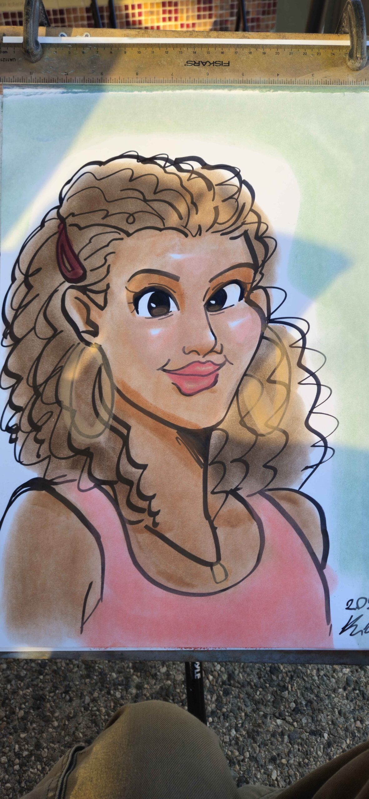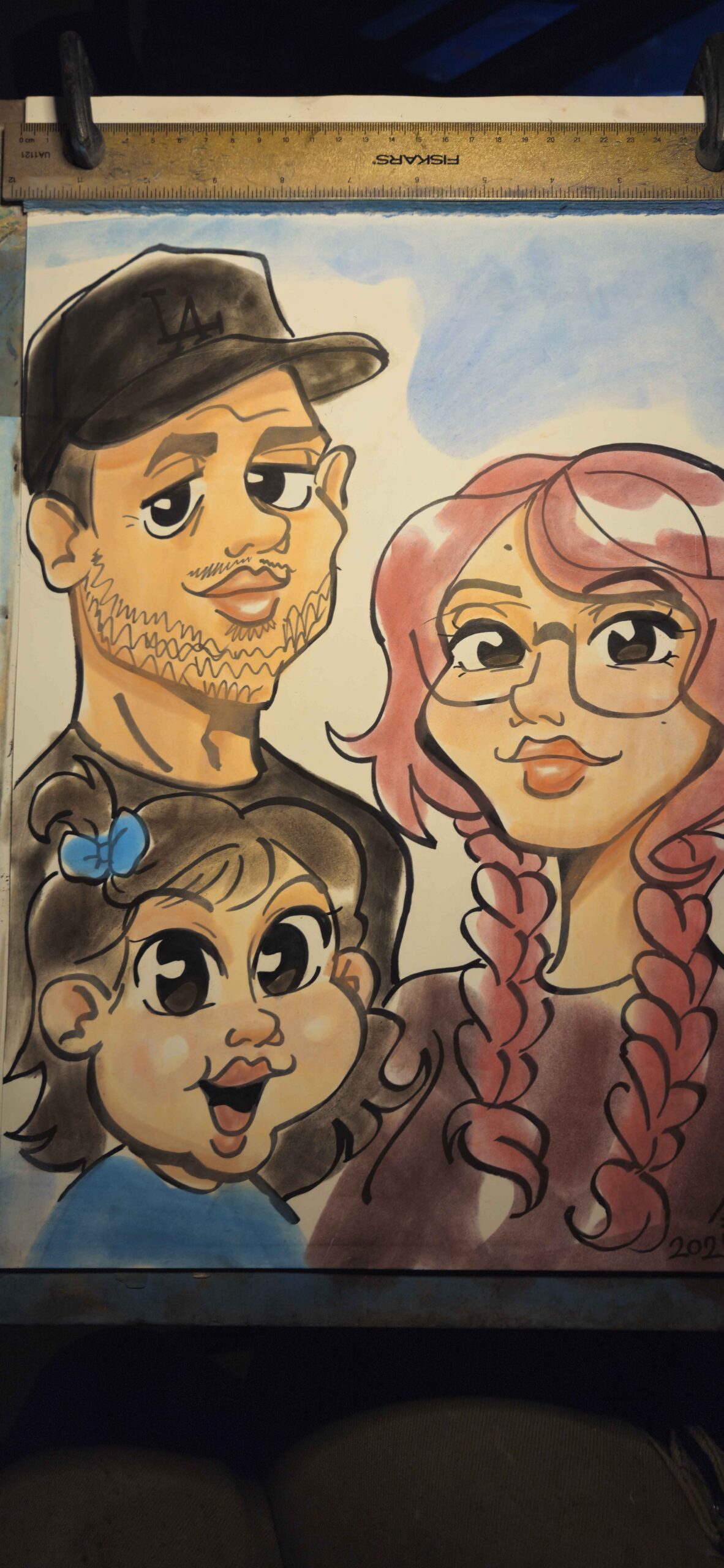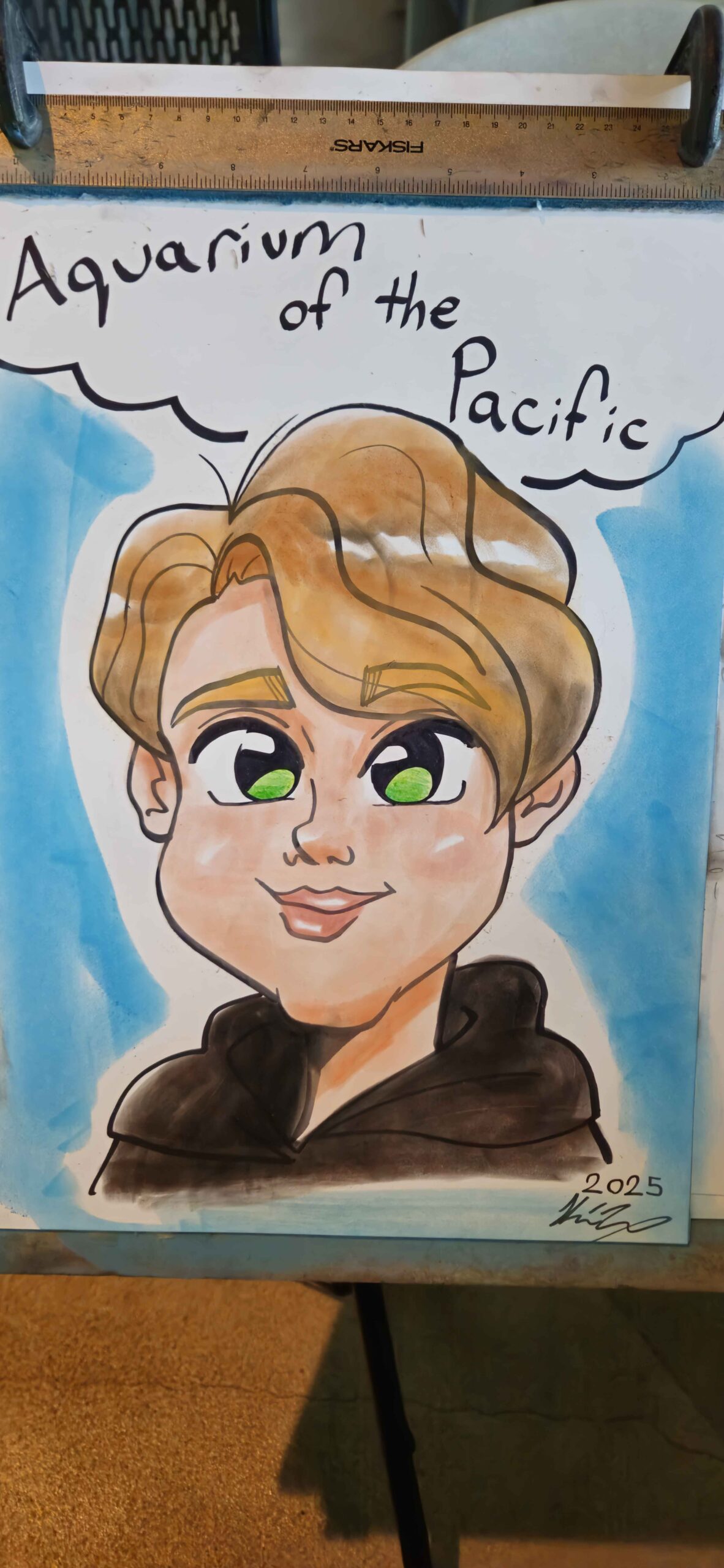 Hi there! I'm a fairly seasoned caricature artist located in Orange County. I specialize in drawing kids, families, and sea critters in both color and black and white! I'm also more than happy to draw your favorite tv, movie, or anime characters for you, if you'd like! If you're looking for a fun and talkative artist for your party or event, I'm almost always available! Please shoot me a text or email if you'd like to book my services!